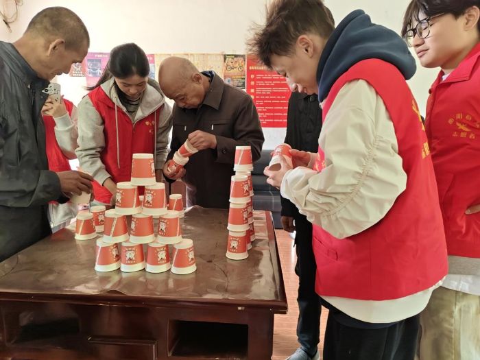 游戲環(huán)節(jié),志愿者把“清肺拍拍操”編成順口溜,老人們?cè)谳p快節(jié)奏里邊笑邊抬手拍肩;隨后進(jìn)行的“紙杯套娃”引來(lái)陣陣喝彩,彩虹塔一搭好,套中者喜獲糖果獎(jiǎng)勵(lì),笑聲在院子里此起彼伏。短暫的熱鬧過(guò)后,志愿者或推輪椅、或挽手臂,陪老人漫步曬太陽(yáng),閑話家常,細(xì)細(xì)傾聽歲月故事,陽(yáng)光灑在皺紋間,溫情悄然流淌。