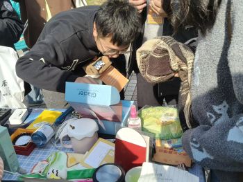 活動現場,我們將收集到的物品分類擺放,不久,便有許多同學被琳瑯滿目的商品所吸引。現場氣氛熱烈,義賣活動有序進行。叫賣聲、歡笑聲、討價還價聲交織成最動聽的校園旋律,也引起周圍同學的好奇,紛紛加入,在各個攤位前細細挑選,用實際行動支持義賣。“這個手繪扇子很別致,既能用又能獻愛心,必須支持!”一位戴眼鏡的女同學笑著買下了手繪制品。