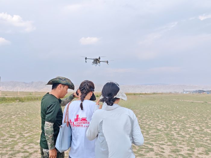 此外,實踐團還深入永昌縣紅山窯鎮騸馬墩灘草原區,實地觀摩考察草原植被恢復滅蝗行動。永昌縣草原工作站積極響應生態保護號召,全面開啟草原蝗蟲防治工作,致力于恢復草原植被,維護生態平衡。在此期間,甘肅綠控生態有限公司采用無人機飛防的創新方式開展滅蝗行動。觀摩過程中,學生們全神貫注觀看無人機操作。飛手不僅進行了專業的演示操作,還給予學生們實踐操作無人機的學習機會。通過此次觀摩,學生們對綠色生態保護有了更直觀、深刻的認識。有力推動著永昌縣草原綠色生態的持續改善,共筑起了一道堅不可摧的草原保護屏障。