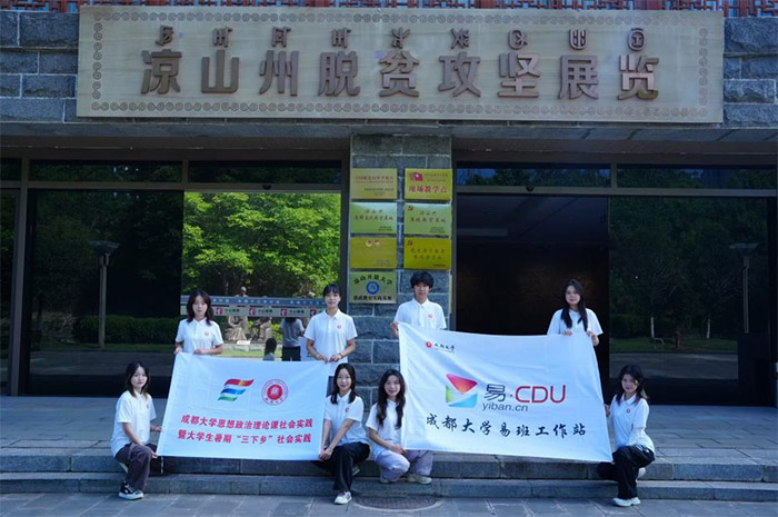 圖為實(shí)踐團(tuán)成員于涼山州脫貧攻堅(jiān)展覽館合影。