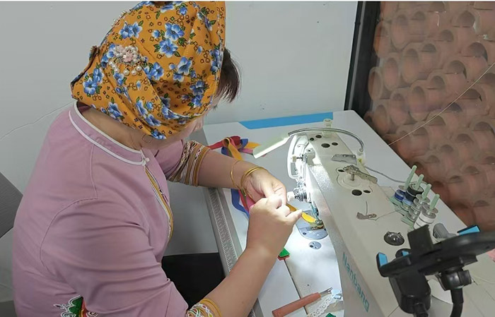 實地調研,挖掘服飾內涵 實踐團奔赴惠安縣小岞鎮,這里是惠女服飾文化的重要發源地之一。團隊先后走訪了李開白女士的惠女服飾制作工作室、小岞美術館的惠女服飾文化體驗館以及李麗英女士的海娘子惠女服飾工作室。在李開白女士的工作室中,實踐團成員與李開白女士談及“牡蠣里”品牌,一方面了解到“牡蠣里”現代設計理念和改進工藝的引入,一方面學習體悟李開白女士不失傳統精髓改革的大膽精神。緊接著到小岞美術館的惠女服飾文化體驗館,豐富的展品和詳實的資料讓實踐團成員們對惠女服飾的發展歷程有了更全面的了解。從古代閩越遺俗與海洋文化、中原文化碰撞交融的起源,到各個歷史時期服飾樣式的演變,成員們仿佛穿越時空,見證了惠女服飾的興衰榮辱。而在李麗英女士的海娘子惠女服飾工作室里,實踐團成員們近距離觀察到了惠女服飾的制作過程。從一針一線的縫補,到色彩搭配的精心考量,每一個環節都蘊含著深厚的文化底蘊。