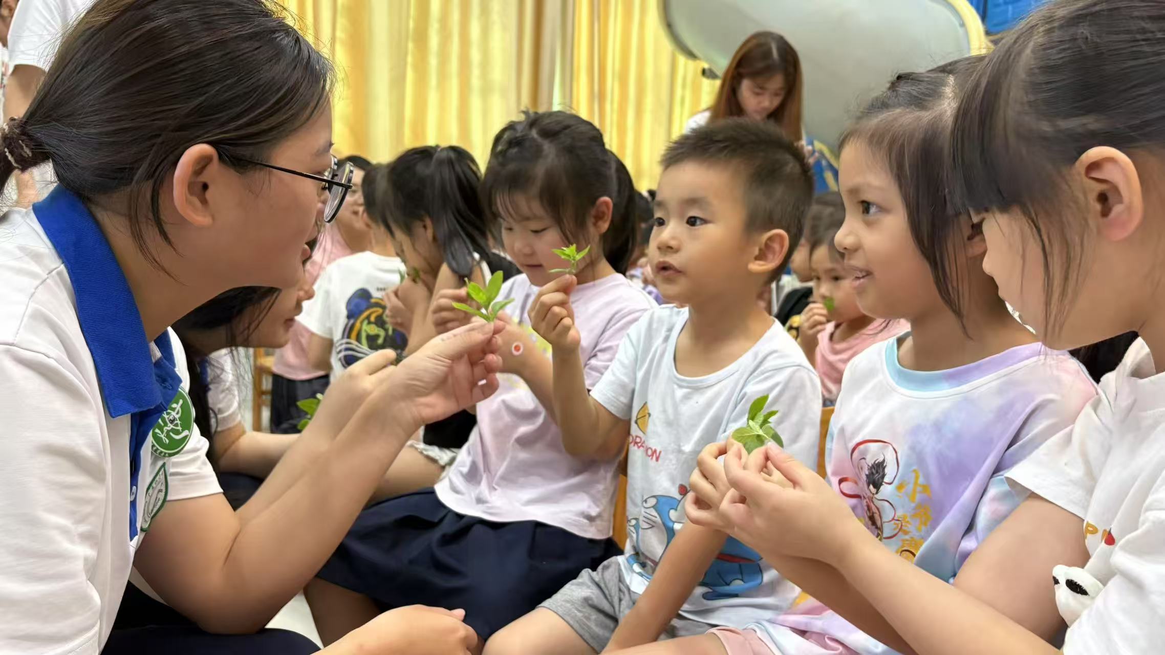 實踐中,孩子們輕嗅薄荷翠葉,觀察葉脈,接過薄荷種子種植杯時,“橙子姐姐”叮囑他們對薄荷苗說悄悄話。這場活動讓萌娃在童話冒險中接觸中醫“藥食同源”智慧,將藥膳知識轉化為可感體驗。