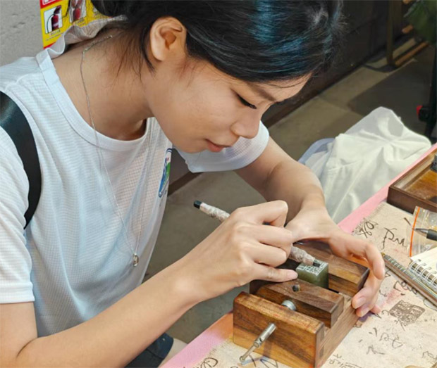 林老板介紹道,市面上的石敢當雕刻設計大多簡單而相似,文化底蘊極低,制造則主要采用機器流水線生產,要想出彩只能從制造工藝下功夫,因此她堅持手工雕刻為主、機器輔助為輔的制造模式。她還向團隊成員詳細展示了玉雕從選料、打胚、塑形到上色的完整流程,并結合自身多年的從業經驗,對比分析了手工雕刻與機器雕刻的差異,她強調機器雕刻的作品缺少靈性,在價值上遠不及手工雕刻產品。雖然手工雕刻的成本極高,但林老板依然堅守著初心,不斷嘗試帶領手工雕刻行業走出困境。通過與林老板的交流以及對市場內其他攤位的走訪,團隊對傳統手工雕刻的技法傳承和經營現狀有了初步的直觀認識。