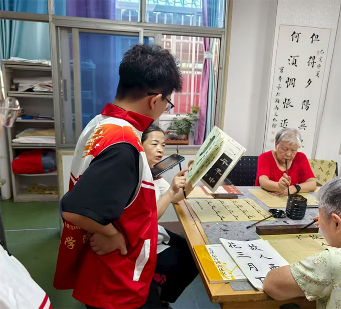 圖為隊員與老人們一起探討和研習書法對于長壽的幫助。廖思琦供圖