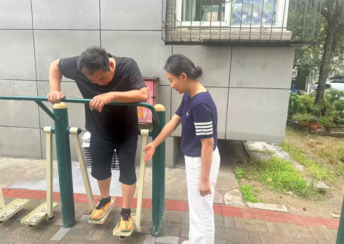 活動中,志愿者現場指導社區居民對器材的使用方式,還有注意事項,并集中講解了運動前熱身、運動后拉伸的必要性及基礎方法。對于年齡較大的居民志愿者特意強調了“量力而行、循序漸進”的安全原則,并采取“分區講解”的模式,將居民引導至不同功能區,進行講解功能。