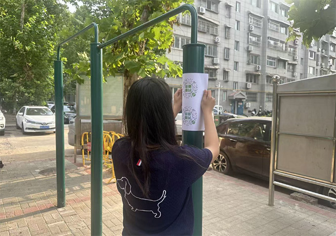 活動現場,志愿者帶好提前準備好的健身指南、視頻二維碼等,在工作人員的引領下,興高采烈地來到了活動場地,趕在下午晚飯前對場地進行規劃和布置,以萬全的準備迎接飯后運動的居民們。
