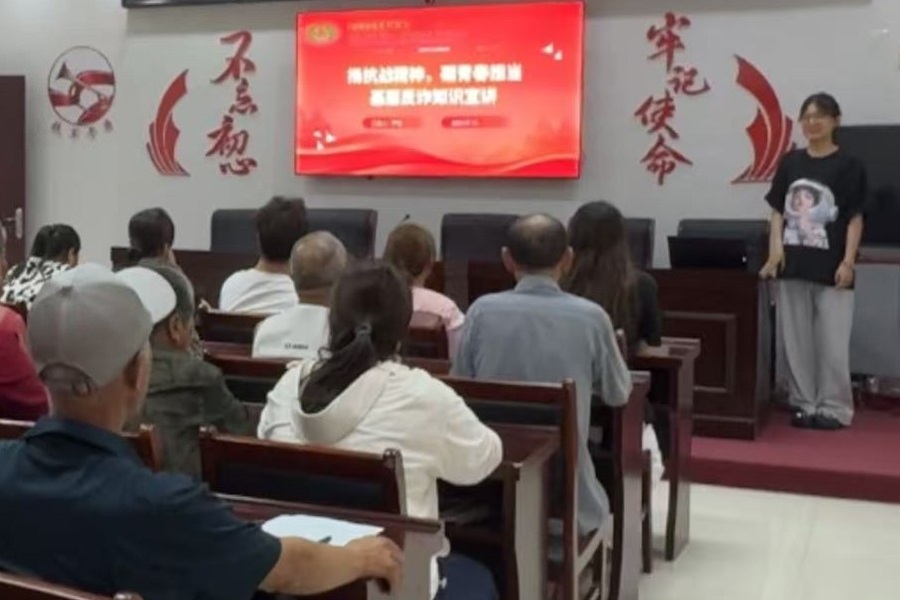 實踐團宣講組成員們返回家鄉,將學習成果融入在地 化宣講。在7 月17 日,實踐團隊走進高彭村,糜璐堯同學 在村委會中通過孩子們易于理解的語言和故事,講述了平 型關大捷中八路軍戰士奮勇殺敵的英勇壯舉。在7 月21 日, 鹽城市濱海縣坎北社區黨群服務中心內嚴文同學結合當下 社會環境,深入剖析保健品詐騙、虛假投資、冒充親屬求救等老年人常見的詐騙類型。7 月23 日的午后,張鵬同學 在東臺市時堰鎮后港社區開展了一場反詐宣傳活動,在一 臺顯示器屏幕上播放著反詐宣傳視頻,并提醒老人“不聽 不信,不轉賬:破解騙局,你我都行!”這些分散進行的 活動,通過將生動的抗戰歷史細節與實用的防詐知識相結 合,使抗戰精神在具體敘事中得以呈現,提升了宣講的針 對性和覆蓋面。