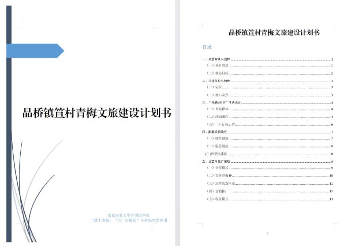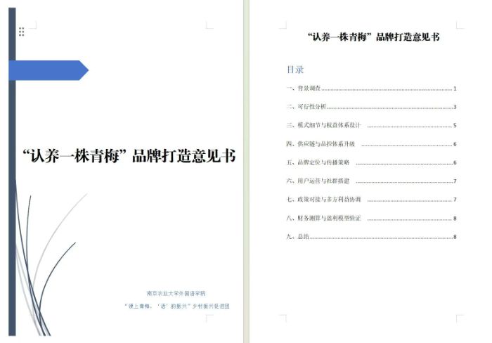 實(shí)地調(diào)研結(jié)束后,團(tuán)隊(duì)迅速召開調(diào)研數(shù)據(jù)整理分析研討會(huì),將碎片化調(diào)研信息轉(zhuǎn)化為系統(tǒng)性解決方案。圍繞笪村“荒地變寶地”的轉(zhuǎn)型路徑、鄉(xiāng)鎮(zhèn)干部產(chǎn)業(yè)攻堅(jiān)的實(shí)踐經(jīng)驗(yàn)、農(nóng)戶對青梅品牌升級的期待等關(guān)鍵議題,成員們結(jié)合外語專業(yè)特長,撰寫了《笪村青梅文旅融合發(fā)展建議書》,提出了“青梅種植體驗(yàn)園+采摘研學(xué)路線+民俗文化展”一體化文旅項(xiàng)目規(guī)劃建議,助力延伸產(chǎn)業(yè)價(jià)值鏈;制定了《“認(rèn)養(yǎng)一株青梅”品牌打造意見書》,設(shè)計(jì)多語言版認(rèn)養(yǎng)協(xié)議與線上互動(dòng)機(jī)制,搭建消費(fèi)者與農(nóng)戶的情感聯(lián)結(jié)橋梁;設(shè)計(jì)“MissGreenPlum”“梅小溧”兩款青梅產(chǎn)業(yè)吉祥物,以鮮活形象提升品牌辨識度,為農(nóng)產(chǎn)品IP化運(yùn)營提供視覺支撐。