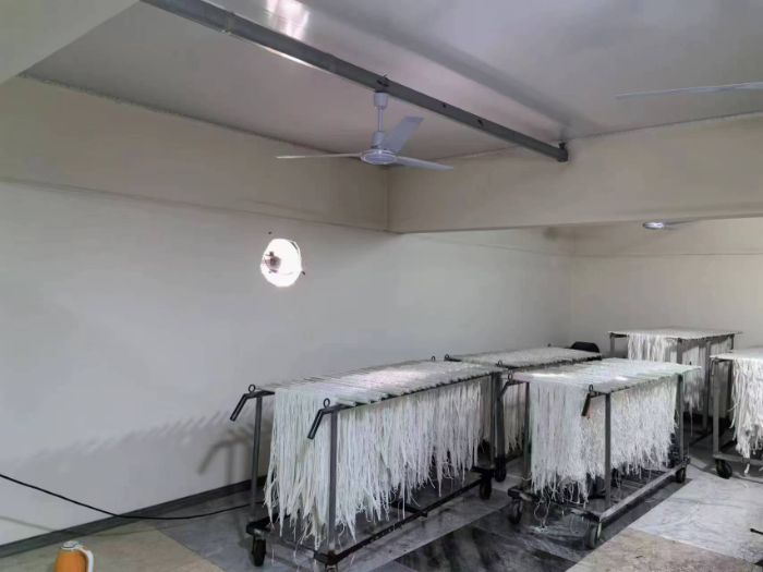 實踐團成員走進當地產業園區與企業,實地探訪馬鈴薯從原料到成品的發展流程。在原料倉庫,整齊堆放著馬鈴薯淀粉等原料,倉庫采用分區堆放,離地倉儲模式,既保障原料新鮮,又便于按需調取;從倉庫取出的淀粉會被送入加工車間,與水按比例混合調漿,工人通過淀粉漿的黏度、色澤通透度等判斷漿體是否達標,以便后續成型;成型是手工粉條的關鍵,工人把淀粉漿倒入帶孔金屬漏勺,高舉輕晃使漿滴入沸水,凝固后沿鍋邊刮出成粉條;成型粉條轉入整潔的晾曬車間,帶輪金屬架整齊排列,架上銀絲般的粉條垂落,借定西干燥氣候,夏季約2天,冬季約3天即可將粉條晾至含水量14%以下;晾干的粉條送入待檢區,工作人員通過看色澤、摸表面、彎折測韌性三步檢查品質,還會抽樣進行檢測,保障產品符合國家標準;合格粉條進入包裝環節,工人按重量分裝,既有面向大眾消費的實用包裝,也有適配禮品饋贈的高端禮盒,包裝后存入陰涼干燥的成品庫,等待發往各地。