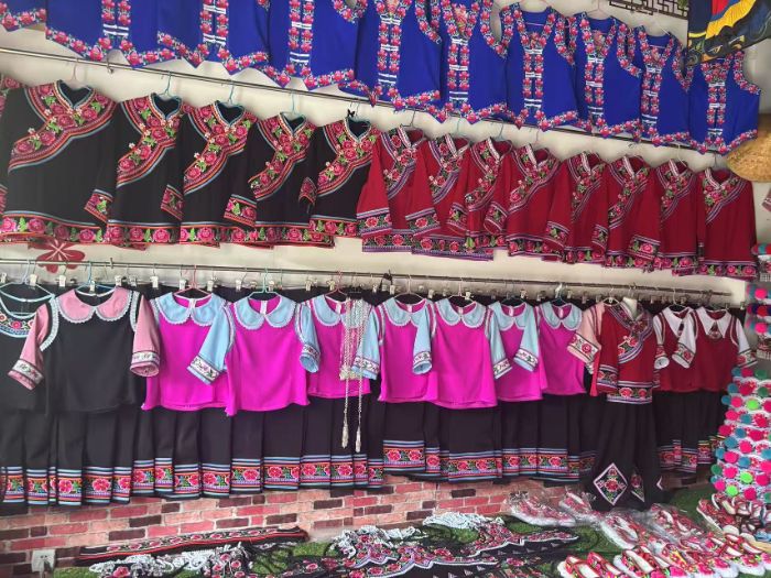 實踐期間,隊員以彝人古鎮店鋪工作人員、刺繡傳承人為主要采訪對象,圍繞彝族服飾的核心要素展開調研。在色彩體系方面,經實地觀察與受訪者介紹確認,彝族服飾以黑、紅、黃為基礎色調,其中黑色象征對土地的敬畏,紅色代表生活熱情,黃色寓意豐收希望。調研中發現,當地服飾常以黑色為底色,搭配大紅色火焰紋與金黃色太陽圖案,形成具有強烈視覺辨識度的色彩組合。