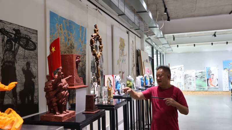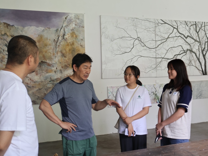 7月11日下午第一站,實踐隊走進草壩鎮塘壩村開展田野調研。通過走訪“厚山房”“秋明山莊”及村內藝術民宿集群,隊員們與藝術家廉學洺、葉宗明深入交流,了解二人如何將村內老木梁、茶園枯枝等閑置資源轉化為藝術裝置,以藏茶膏繪畫、工筆畫還原茶馬古道文化;重點考察“藝術家引導+村民參與”的共創模式,包括廉學洺開設的免費油畫班、葉宗明的木板畫課程,以及這些活動如何帶動400余名村民參與創作,形成“藝術創作+民宿承載+研學賦能”的鄉村振興模式。