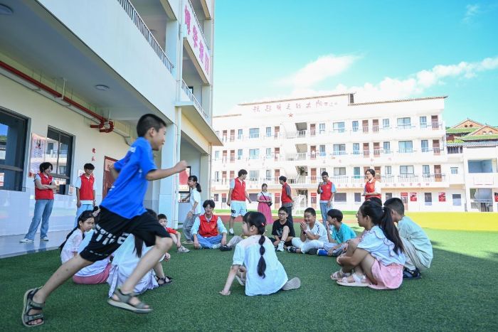 當日上午的體育課堂,成為一片歡樂的海洋。支教隊員們創新教學形式,打破傳統課堂界限,帶領孩子們圍成大大的圓圈,共同參與經典游戲“丟手絹”。在清脆的拍手聲和輕松愉悅的歌聲中,孩子們的眼角眉梢充滿了期待與喜悅,歡樂的氛圍感染著在場的每一個人。隨后的“蘿卜蹲”游戲更是將現場氣氛推向高潮。孩子們全身心投入,口令響亮,動作靈活,認真又俏皮的表現引得隊員們忍俊不禁。陽光下,孩子們肆意奔跑跳躍,洋溢著童真的笑臉成為鄉村校園最動人的風景。實踐隊隊員表示:“孩子們的快樂是如此純粹,每一次互動都讓我們深刻體會到支教的意義——用陪伴激發他們對集體活動和體育鍛煉的熱愛。”