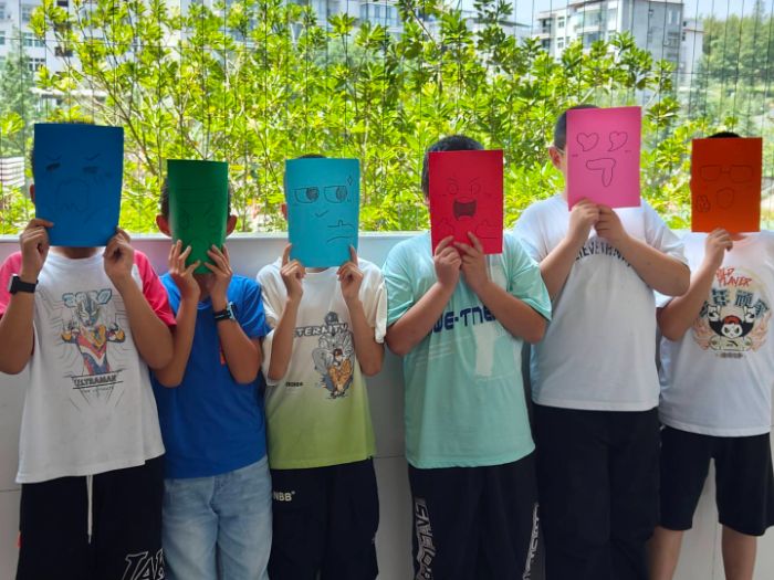 圖為心理課志愿者帶孩子們做情緒表情游戲,孩子們動手創作,樂趣十足。多彩大學生網朱可攝