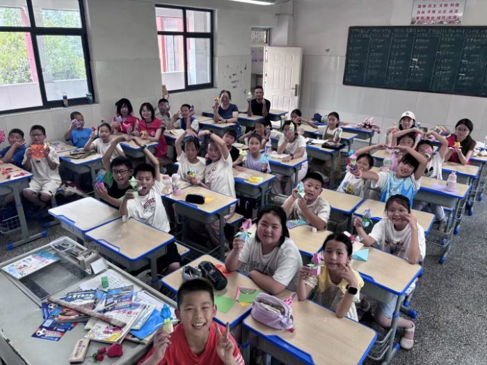 圖為手工課結束后,志愿者帶孩子們展示郁金香折紙并合影,孩子們笑容燦爛,格外開心。多彩大學生網朱可攝