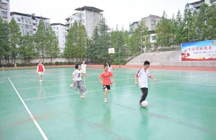 圖為體育課時志愿者和孩子們一起踢足球,孩子們奔跑追逐,活力滿滿。多彩大學生網黃夢婷攝