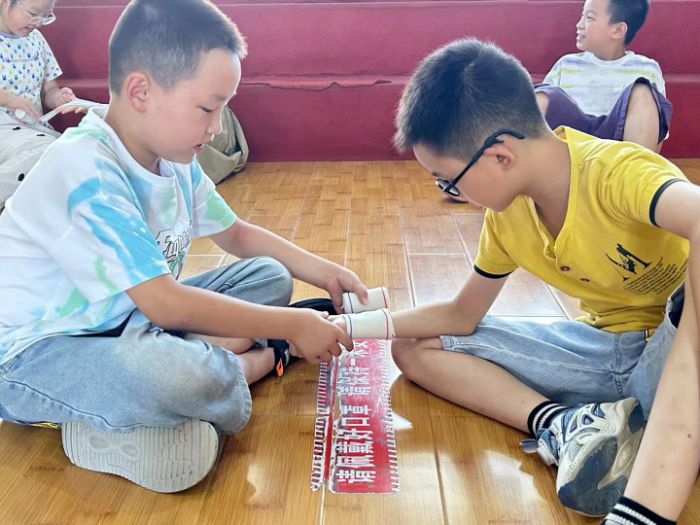 圖為安全課志愿者教孩子們練習包扎方法,孩子們仔細操作,格外認真。多彩大學生網王文秀攝