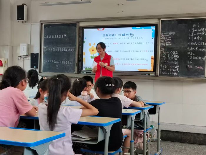 圖為科普課志愿者帶孩子們做互動游戲,講解謠言的可怕,孩子們積極參與,收獲滿滿。多彩大學生網朱可攝