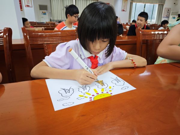 在結束環保宣傳手冊的學習后,隊員們向在座的60位小朋友發起繪畫邀請,并一一分發繪畫工具與紙張。隊員們鼓勵著小朋友們用畫筆描繪自己心目中的綠色家園。小朋友們借著五彩斑斕的畫筆,激情發揮自己的想象力,騰躍于一張張畫紙上的綠色家園:是春天隨風搖曳的柳樹、是夏日艷陽下綠油油的小山、是草原里可愛迷人的小花貓。一幅幅畫作充斥著純真的想象與對自然誠摯的熱愛。緊隨其后的手工環節更是精彩絕倫,小朋友們迫不及待地開始創作——剪花鳥、涂色彩,小小的手指翻飛如蝶。"我要剪一只會唱歌的太陽鳥!"小朋友清脆的聲音響起,引得周圍孩子爭相模仿。隊員們穿梭指導,將剪紙技巧與環保知識巧妙結合:"小鳥的翅膀要剪得寬些,就像我們保護森林的大手呀!"教室里笑聲與討論聲此起彼伏,先前畫作中的柳樹和小花貓,此刻在剪紙中躍然重生。當孩子們把完成的作品拼貼在"綠色家園"主題板上時,環保的種子已從筆尖蔓延到心尖,在協作與創造中抽枝展葉。