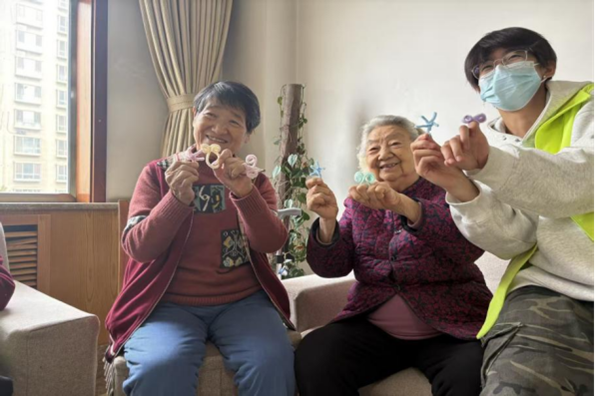 (志愿者與老人們展示扭扭棒手工成品 攝影|劉柳)