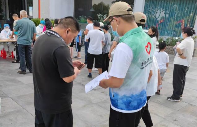 家在河南省南陽(yáng)市的隊(duì)員,申請(qǐng)了家鄉(xiāng)的志愿者崗位,為家鄉(xiāng)疫情防控貢獻(xiàn)青春力量。隊(duì)員們?cè)缟衔妩c(diǎn)鐘就得起床,五點(diǎn)半在街道集合,領(lǐng)取相關(guān)物資后到達(dá)各自服務(wù)地點(diǎn)。他們主要負(fù)責(zé)協(xié)助所在社區(qū)組織參與核酸檢測(cè)的居民按照防疫政策的要求排好隊(duì)伍并維持現(xiàn)場(chǎng)秩序,同時(shí)幫助居民進(jìn)行核酸檢測(cè)的登記工作以及普及防疫政策。