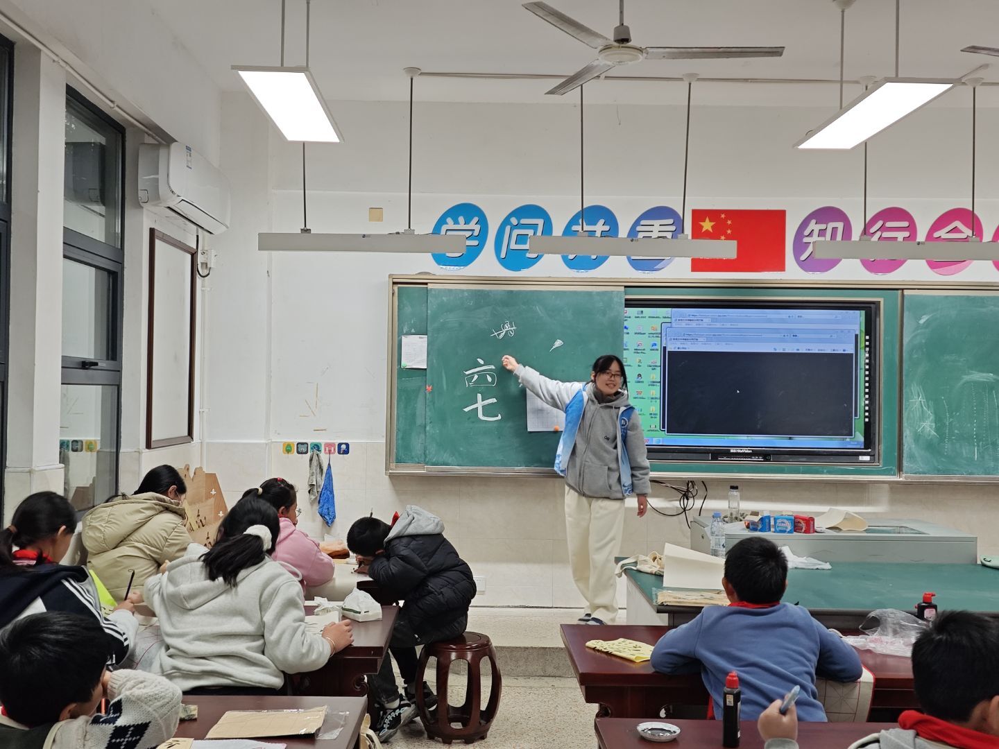 “橫畫要像千里陣云,平穩舒展;豎畫好比萬歲枯藤,挺拔有力。”書法課堂上,社團成員化身暖心“小老師”,從握筆的指法、運筆的力道等基礎要點細致講起,將抽象的筆墨精髓,化作“千里陣云”“萬歲枯藤”這般鮮活可感的意象。他們手把手扶正孩子們的手腕,耐心糾正每一處姿勢偏差;逐字拆解漢字結構,用通俗的語言點撥間架布局的竅門,更巧妙穿插“活字拼字”小游戲,讓孩子們在動手拼搭的樂趣中,輕松摸清字形組合的規律。原本稍顯枯燥的書法練習,也隨之變得妙趣盎然、意趣十足。